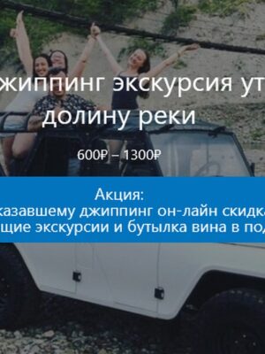Экскурсия проходит в первой половине дня, продолжительность 4 часа. Выезд из Лазаревского в 10:00.Для заказа джиппинга в Адлере в долину реки Аше оформите заказ в сайте объявлений и укажите дату и время экскурсии.