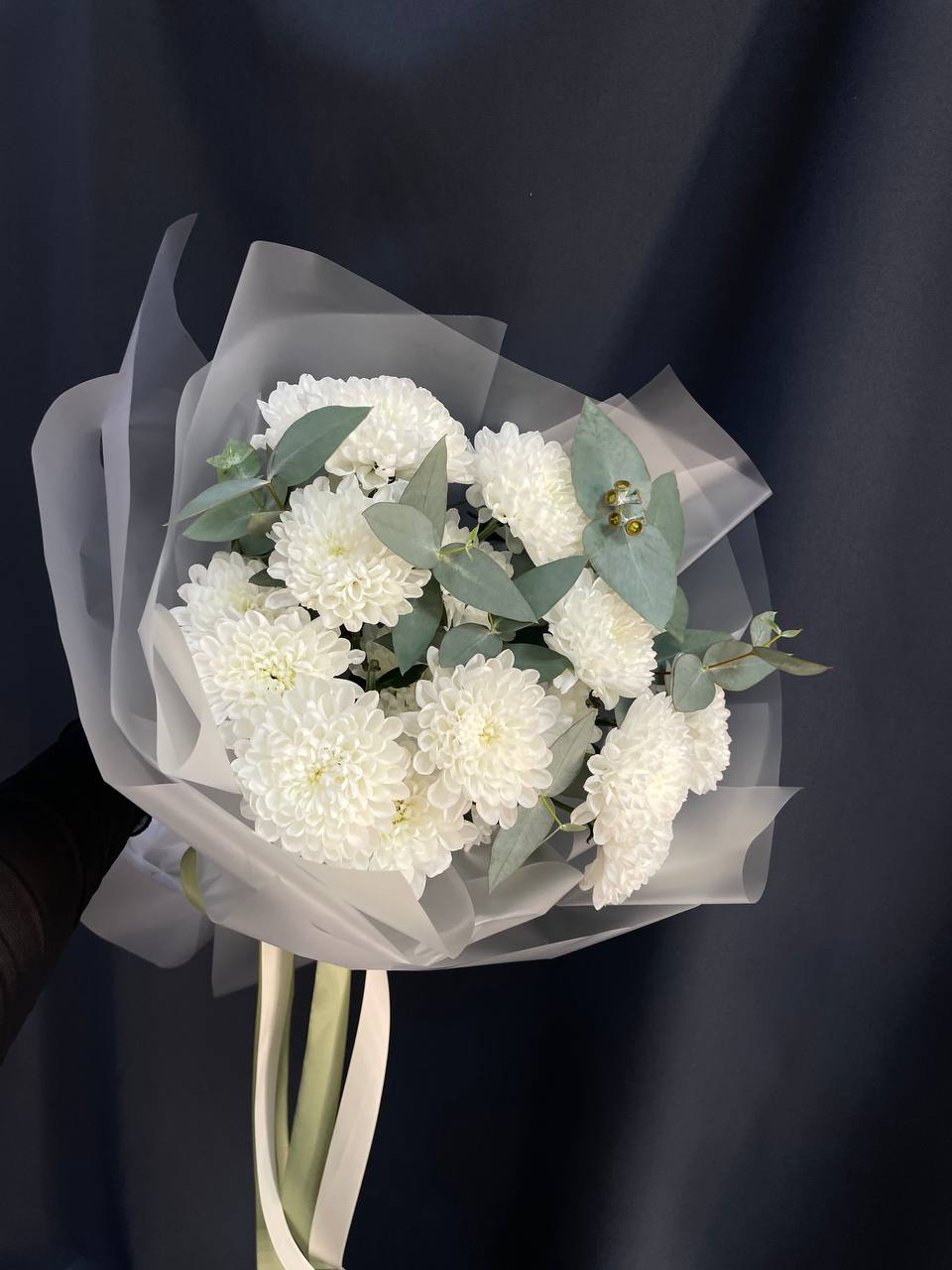 Собранный вручную из свежих цветов букет из кустовой хризантемы и эвкалипта